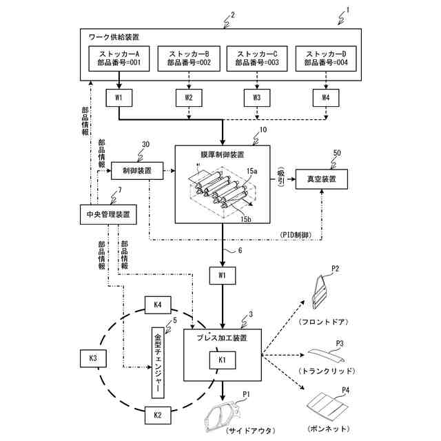 【解決手段】制御装置30は、中央管理装置7から送信される部品情報を受信し、プレス加工装置3に送るワークWの表裏面に形成された油分を吸引する吸引ロール15a,15bに接続された真空装置50の吸引圧を、インバータで真空装置50が備える2台の真空ポンプのモータの周波数をPID制御することにより、部品情報が指定する設定真空圧に収束させ、表裏面に形成された油膜層の膜厚を制御する。制御装置30のPLCは、中央管理装置7から送信された部品情報に含まれる設定真空圧に応じて2台の真空ポンプのうち駆動させる真空ポンプの台数を切り替える。