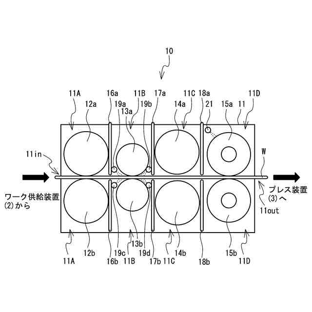 真空ポンプの設定真空圧を高くすると、ワークの表裏面に形成される油膜層の膜厚は薄くなる。その反対に、設定新空圧を低くすると、ワークの表裏面に形成される油膜層の膜厚は厚くなる。プレス加工によるワークの変形量はプレス加工するパーツに応じて異なる。一般的にプレス加工によるワークの変形量が大きいほど、ワークの表裏面に形成する油膜層の膜厚を厚くすることが求められる。例えば自動車のサイドアウタのようなパーツはプレス加工によるワークの変形量が他のパーツと比較して大きい。この場合、膜厚を厚くする為に、他のパーツを製造するときの設定真空圧よりも低くすることが必要である。