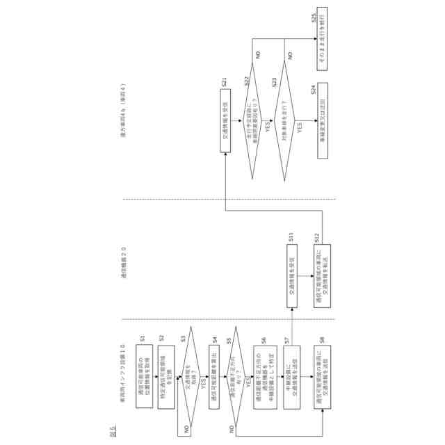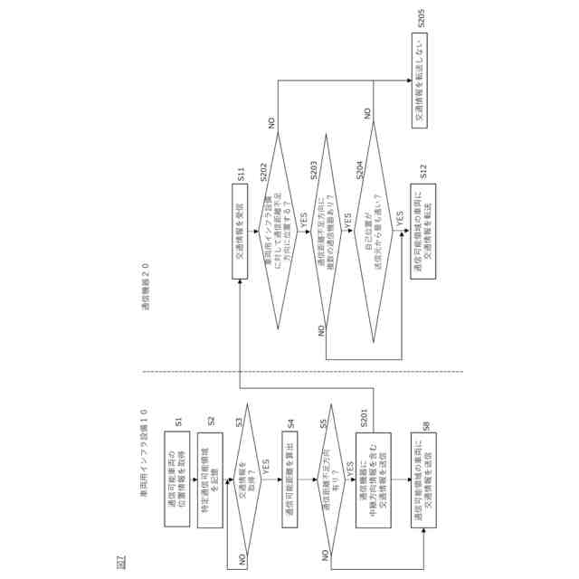 図1に示す車両用インフラシステムにおいて、車両用インフラ設備及び通信機器が交通情報を送受信する手順及び交通情報を受信した車両の運転制御を示すフローチャートである。