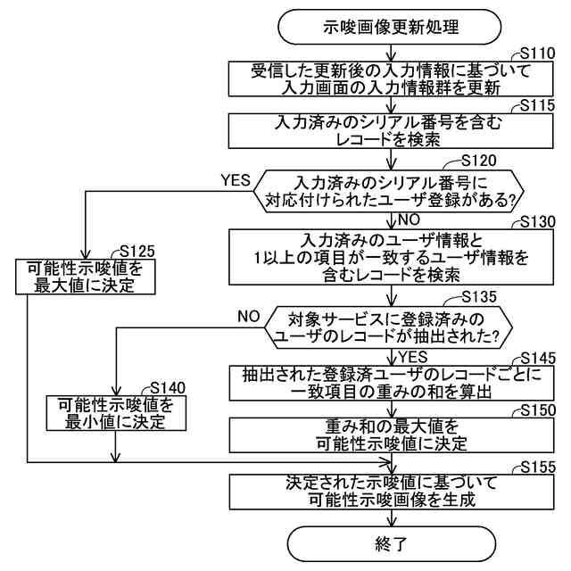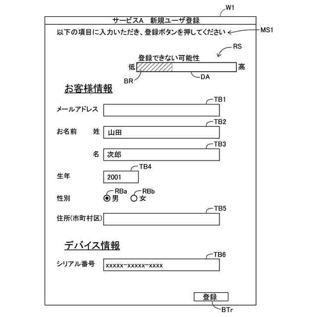 入力画面に複数の項目の情報の入力を行った後に登録指示を入力した場合に、登録条件を見たさないためにユーザ登録が行われないと、ユーザは、入力が無駄になったこと等に起因して不満を感じる場合がある。上記構成によれば、入力中状態において、入力画面に入力済みの情報に基づいてユーザ登録が許可される可能性を示唆する示唆値が決定され、該示唆値に基づく示唆情報が入力画面に表示される。この結果、ユーザは、情報の入力中に、ユーザ登録が許可される可能性をある程度認識できる。したがって、ユーザは情報の入力の途中でユーザ登録を断念することも可能になる。また、情報の入力を行った後に登録指示を入力した場合にユーザ登録が行われなかったとしても、ユーザは、ユーザ登録が行われないことを予見し得るので、不満を感じ難い。このように、ユーザ登録のために入力画面に対する情報の入力をユーザに求める場合に、ユーザが感じ得る不満を低減できる