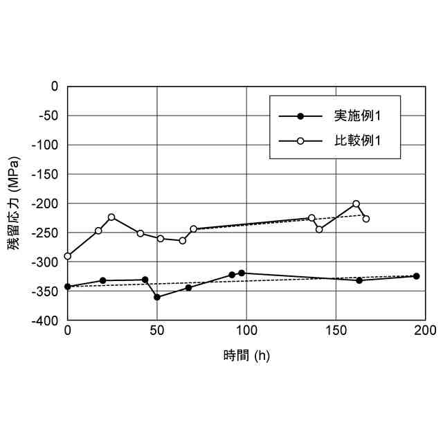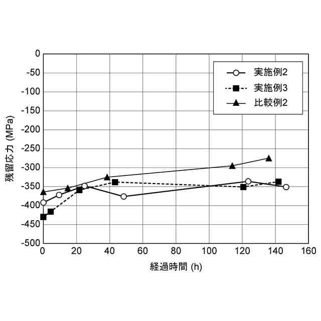 図5は、実施例及び比較例における、アルミニウム合金部材の残留応力と経過時間との関係を示すグラフである。