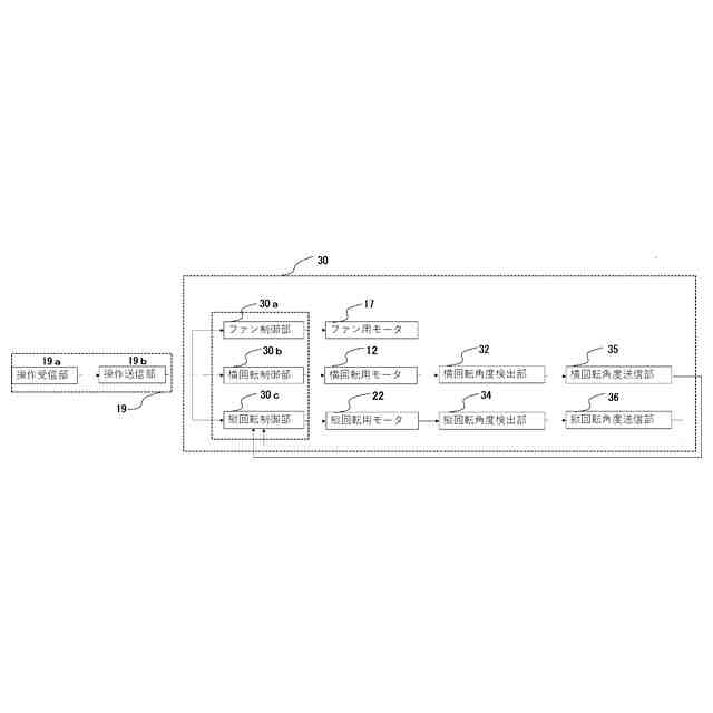 【解決手段】横回転角度と縦回転角度によって決まる送風方向にファン16を回転させて送風する送風部100と、横回転軸を中心に送風部100を横回転用モータ12により横回転動作させて、横回転角度を変化させる横回転部31と、横回転軸に垂直である縦回転軸を中心に送風部100を縦回転用モータ22により縦回転動作させて、縦回転角度を変化させる縦回転部33と、横回転部31を制御する縦回転角度固定モード、縦回転部33を制御する横回転角度固定モード、横回転部31と縦回転部33を連動させて制御する縦横回転角度連動モードにおいて、送風部100から送風され送風対象物に当たる単位面積当たりの風量が一定になるように、横回転部31と縦回転部33を制御する制御部30と、を備える。