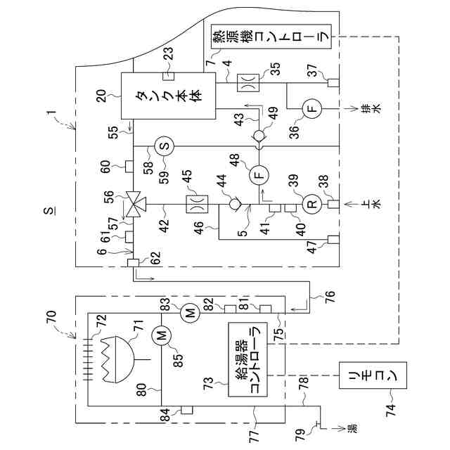 タンク本体20は、所定容量(例えば50L)の湯水が貯留可能で、内部には、湯水の温度を検出するタンク温度センサ23が設けられている。タンク本体20は、本開示のタンクの一例である。