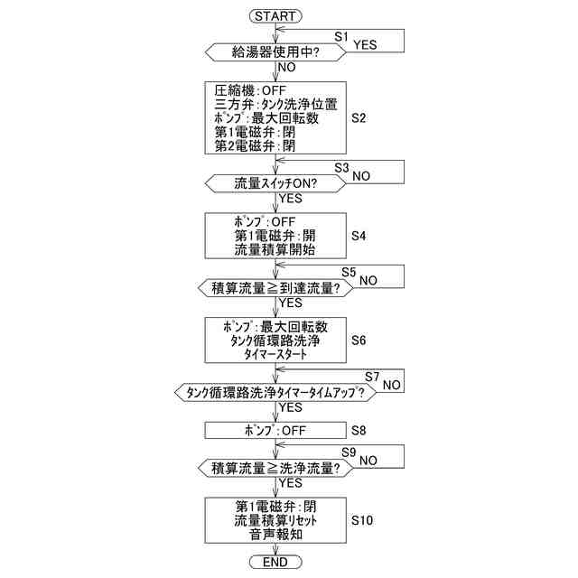 本開示の第2の構成の別の態様によれば、上記効果に加えて、洗浄運転の後の出湯運転時に熱源側流量センサで検知される流量と給湯器の流量センサで検知される流量とに差があれば出湯運転を停止させるので、洗浄運転後にバルブを閉め忘れたまま出湯運転が行われて水が無駄に排出されることがなくなる。