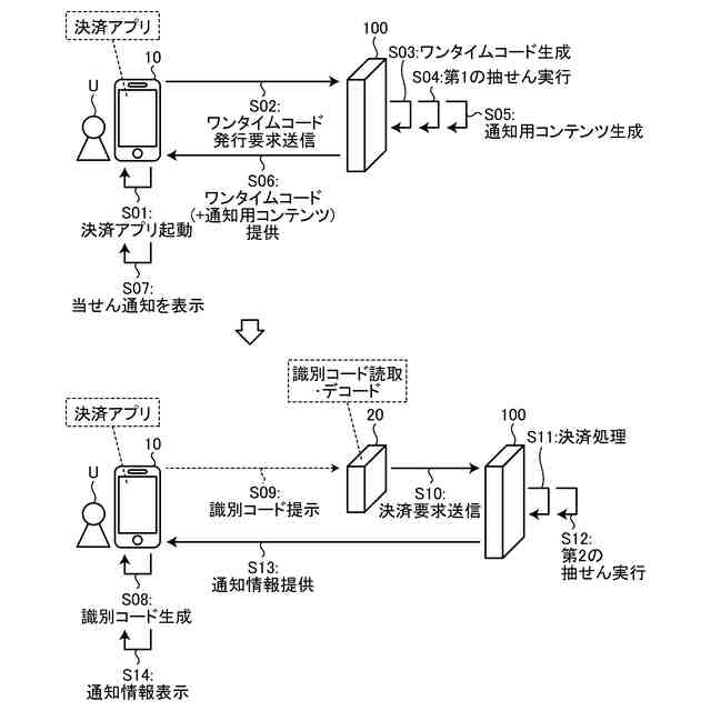 前記ワンタイムコードの発行要求元である前記利用者が前記第1の抽せんに当せんした場合、前記利用者に対して当せん通知を行うための通知用コンテンツを生成する生成工程と、