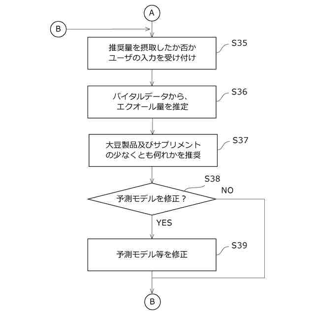 前記イソフラボンの推奨量を前記ユーザが摂取したことを示す情報を受信した後に算出される摂取後のエクオール不足量が所定の条件を満たす場合、前記目標量と摂取後のエクオール不足量との関係に基づいて、前記予測モデル、又は前記不足量若しくは前記推奨量の補正係数を修正する