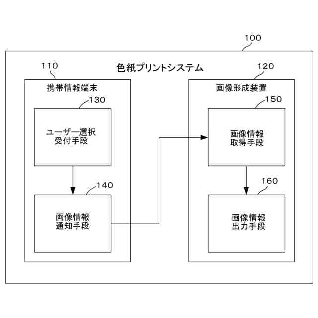 図1で示すように、本実施の形態に係る色紙プリントシステム(以下、単に「本システム」という。)100は、スマートフォンの様な携帯情報端末110、画像形成装置120を含む。なお、携帯情報端末110と画像形成装置120とは、通信ネットワーク260を介して接続される。
