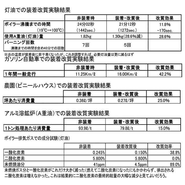 Oになる。炭素数の連鎖が長い程、燃焼効率は向上する。煤(すす)が発生しないからである。当技術により、重油の炭素数が減少し、その分、ガス化される。上記技術は、分留装置と同意である。これらは、炭素と水素から構成される化石燃料に対して、特別に計算された多重波放射による高周波電波が衝突する事により、化石燃料中の重油に対して、共振現象を呈し、共鳴させる事により化学結合を解き、化石燃料をガス化させながら、不純物である窒素・硫黄をも共振させ完全燃焼と同様の状態を形成する。その結果、炭素数が減少する。