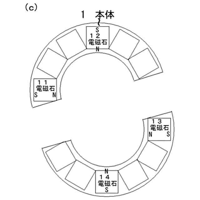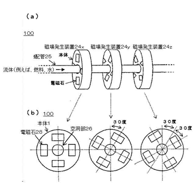 上記課題を解決するために、本発明に係る分子間結合力低減装置は、流体を細分化する分子間結合力低減装置であって、前記分子間結合力低減装置は、前記流体に対して磁場を作用させる、n個(nは2以上の整数)の磁場発生装置と、前記磁場発生装置に電圧を供給する電圧発生回路と、を備え、前記電圧発生回路は、直流電力を生成する直流電源供給部と、前記直流電力を制御する制御装置と、前記直流電力を増幅する電力増幅回路と、を備え、n個の前記磁場発生装置は、前記流体が通る配管に前記配管に沿って所定の間隔を隔てて設置されるものであり、n個の前記磁場発生装置の各々が中心部に前記配管を貫通させるための空洞部を有する円盤状の本体と、前記本体に設けられた少なくとも2個の電磁石を具備しており、前記制御装置は、ハイレベル期間と前記ハイレベル期間に続く前記ハイレベル期間よりも長いローレベル期間とを有するパルス電圧を、隣り合う前記磁場発生装置間で一定期間だけずらして前記磁場発生装置の電磁石に順次繰り返して印加するように前記電圧発生回路を制御し、前記配管を中心に回転する磁場を形成することを特徴とする。また、本発明に係る分子間結合力低減装置は、流体の分子を細分化する分子間結合力低減装置であって、前記分子間結合力低減装置は、前記流体に対して磁場を作用させるn個(nは1以上の整数)の磁場発生装置と、前記磁場発生装置に電圧を供給する電圧発生回路と、を備え、前記電圧発生回路は、直流電力を生成する直流電源供給部と、前記直流電力を制御する制御装置と、前記直流電力を増幅する電力増幅回路と、を備え、前記磁場発生装置は、配管または容器の周りに前記配管または容器に沿って所定の間隔を隔てて設置されるものであり、前記磁場発生装置の各々が、中心部に前記配管または容器を貫通させるための空洞部を有する円盤状の本体と、前記空洞部に対して放射状に、前記本体に設けられた複数個のグループに分けられる複数の電磁石を具備しており、円盤状の前記本体が、2個の半円盤状の部分に分離されることができ、かつ分離された状態の半円盤状の部分における前記空洞部に対応する場所に前記2個の半円盤状の部分を相互に嵌合することにように組み立てられており、前記制御装置は、ハイレベル期間と前記ハイレベル期間よりも長いローレベル期間とを有するパルス電圧を、各磁場発生装置における1つのグループの電磁石をそれぞれに同時に印加することと、次に一定期間だけ遅らして各磁場発生装置における他のグループの電磁石を同時に印加することであって、残りのグループの電磁石についても、さらに前記一定の期間だけ遅らせて同時に印加することを繰り返すことと、を繰り返すように前記電圧発生回路を制御し、前記配管または容器に入った流体に対して回転する磁場が形成することを特徴とする。このような構成により、特に、流体、例えば、化石燃料や水のクラスタを細分化することができる分子間結合力低減装置を実現している。