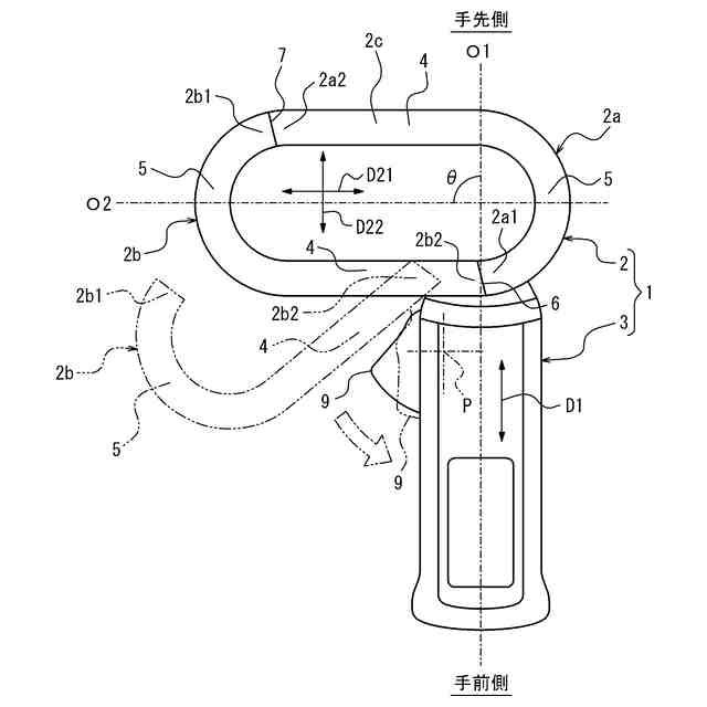 前記正面視において、前記閉状態の前記クランプ部の長手方向は、前記把持部の長手方向に対して45°を越え直角以下の角度をなし、