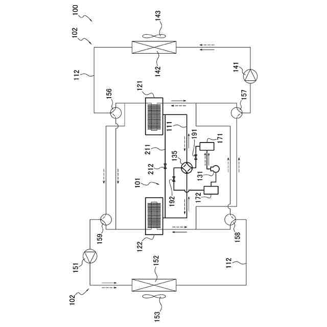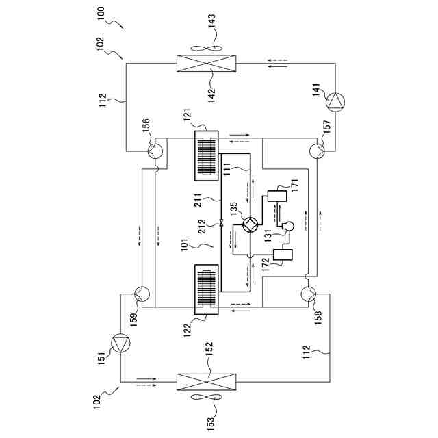 冷媒の圧力の変化に応じて冷媒を吸着及び脱着する吸着材(181)を有し、かつ、前記吸着材が冷媒を吸着する際に発生する温熱、及び、前記吸着材が冷媒を脱着する際に発生する冷熱が回収される、第1吸着器(121)及び第2吸着器(122)と、