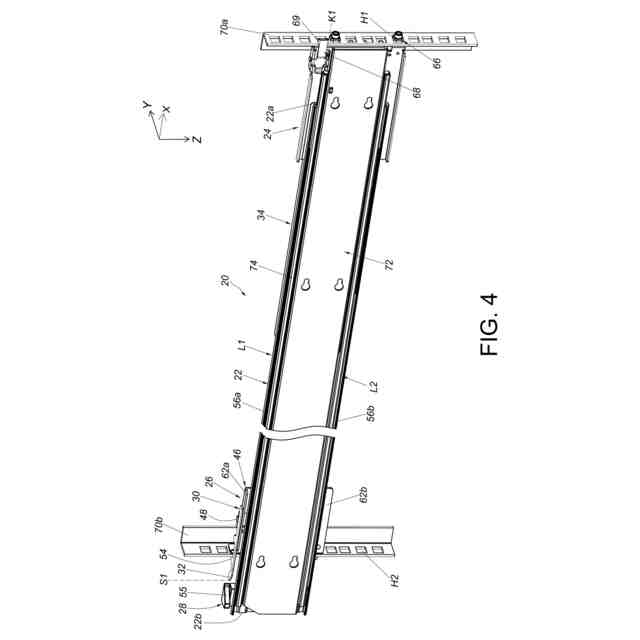 第1レール22は、第1所定特徴部28を含む。第1ブラケット装置24は、第1レール22に配置されている。第2ブラケット装置26と第1レール22とは、長手方向に相互に対して移動可能である。図の中で、X軸は長手方向(又はスライドレールの長さ方向又は移動方向)であり、Y軸は横断方向(又はスライドレールの横方向)であり、Z軸は縦方向(又はスライドレールの高さ方向)である。第2ブラケット装置26は、ロック部材30を含む。ロック部材30は、第2所定特徴部32を有し、第2所定特徴部32は、第1所定特徴部28と相互作用するように構成されている。