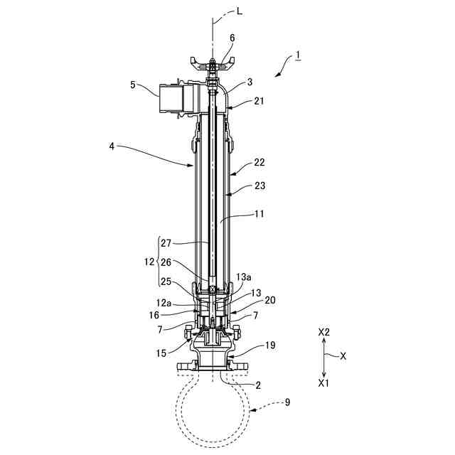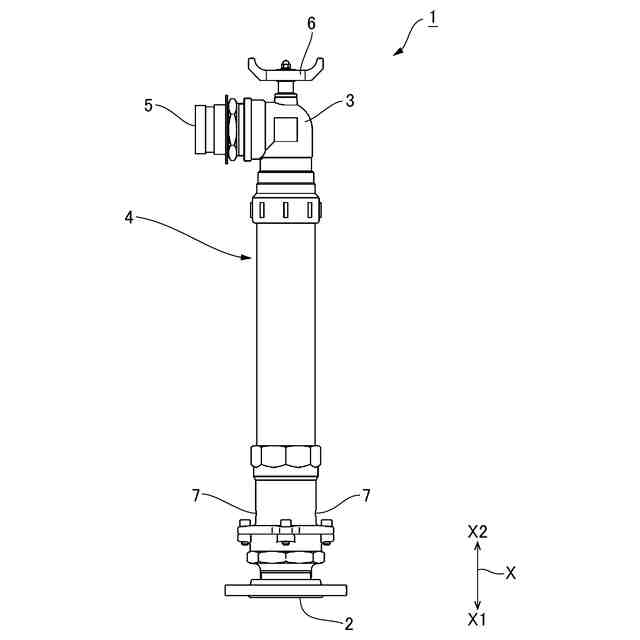 上記課題を解決するために、本発明は、下端に取水口を備え、上側部分に放水口を備え、内部に前記取水口と前記放水口とを接続する内部流路を備える管部と、前記管部の内側で上下方向に延び、外周面に雄ネジを備える弁軸と、前記放水口の下方で前記管部の内側に固定され、前記雄ネジに螺合する雌ネジを備える筒状の支持部と、前記内部流路を開閉する弁機構と、前記支持部の前記下方で前記管部を前記上下方向と交差する方向に貫通する排水口と、前記排水口を開閉する排水弁機構と、を有し、前記弁機構は、前記排水口の