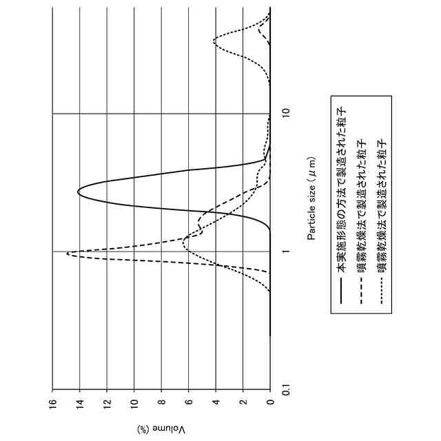 図1は、本実施形態の方法で製造された粒子と噴霧乾燥法で製造された粒子の粒度分布の一例を示す図である。