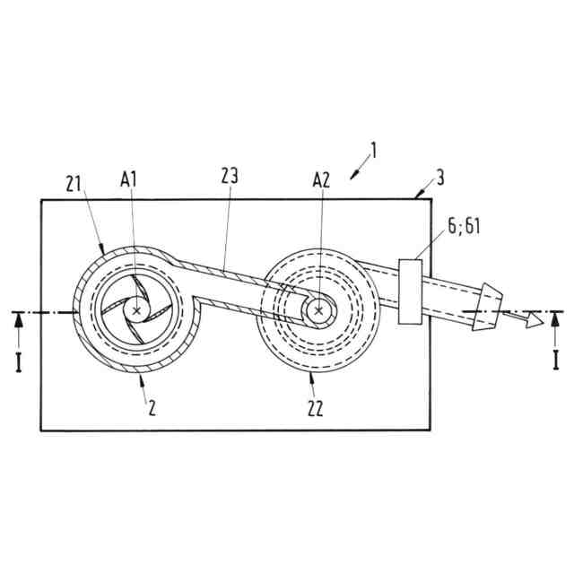 【解決手段】使い捨てデバイス2は、再利用可能なデバイス3内に挿入され、直列に前後に配置される2つのポンプ・ユニット21、22を備え、各ポンプ・ユニットは、ベアリングレス・モータのロータとして設計されたロータを備え、非接触で磁気的に浮上させて駆動することができ、再利用可能なデバイス3は、ロータを回転させる電磁回転駆動装置を形成する、ステータ31、32をロータごとに備え、各ステータは、それによってロータを非接触で磁気的に駆動でき、且つ非接触でステータに対して磁気的に浮上させ得る、支持及び駆動ステータであり、それぞれのステータを別々に起動させる、別々の制御デバイスがステータごとに備えられる。