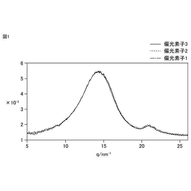 偏光素子1~3について、測定用サンプルの散乱プロファイルからバックグラウンドの散乱プロファイルを差し引いたものについて、波数qに対してプロットしたグラフを示す。