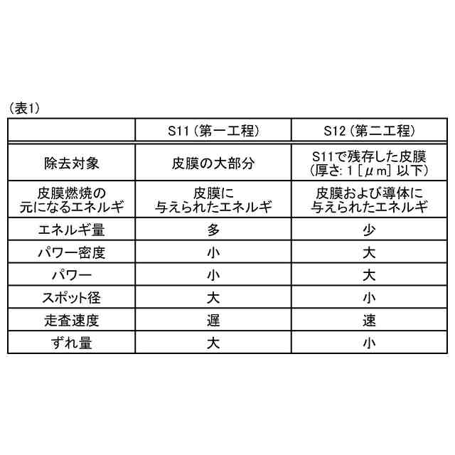 【解決手段】皮膜除去方法は、芯線と有機高分子材料で作られた絶縁性の皮膜とを有した電線の皮膜を除去する皮膜除去方法であって、電線を当該電線の表面にレーザ光を照射可能な位置に設置する工程と、電線の表面のうち皮膜を除去する対象領域の各場所について、300[nm]以上かつ500[nm]以下の波長のレーザ光を複数回照射することにより、皮膜を除去する除去工程と、を有する。除去工程は、レーザ光から皮膜に与えられたエネルギによって当該皮膜を燃焼して薄くする第一工程と、レーザ光から芯線および皮膜に与えられたエネルギによって第一工程で薄くなった皮膜を燃焼して除去する第二工程と、を有してもよい。