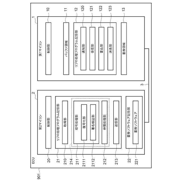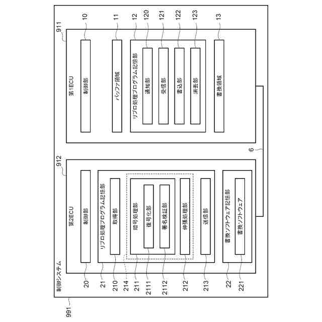 リプログラミングの1つの手法として、診断機等のソフトウェア書換装置から、有線通信によって、リプログラミング用のソフトウェアを配信する手法がある(例えば、特許文献1)。リプログラミングの他の1つの手法として、OTA(Over The Air)と呼ばれる無線通信によって、リプログラミング用のソフトウェアを配信する手法がある(例えば、特許文献2)。