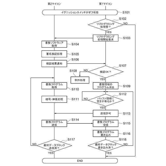 したがって、シングルバンクマイコンでは、車両の制御機能を提供する必要がない駐車中(イグニッションスイッチがオフ状態の際)等にリプログラミングを行う必要がある。すなわち、駐車中等にリプログラミングを行う場合、リプログラミングが完了するまでの間は、走行すること(イグニッションスイッチをオン状態に移行すること)ができないので、ユーザのダウンタイムが発生してしまう。
