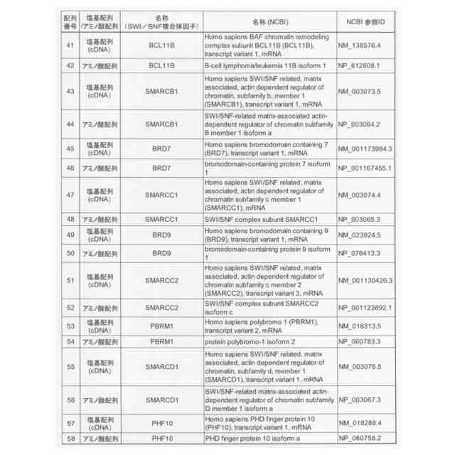 例えば、非特許文献4には、非小細胞肺がんにおいて、SWI/SNF複合体因子であるSMARCA4の欠損がCDK4/6阻害剤と合成致死関係にあることが記載されており、非特許文献5には、SMARCA4が欠損した肺がんが、OXPHOS(ミトコンドリアの酸化的リン酸化)阻害剤に対する感受性を増加させたことが記載されており、非特許文献6には、非小細胞肺がんにおけるSMARCA4の遺伝子の変異が、Auroraキナーゼ阻害剤に対する感受性を増加させたことが記載されており、非特許文献7には、同じくSWI/SNF複合体因子であるARID1Aの遺伝子の変異がGSH合成阻害剤と合成致死関係にあることが記載されている。