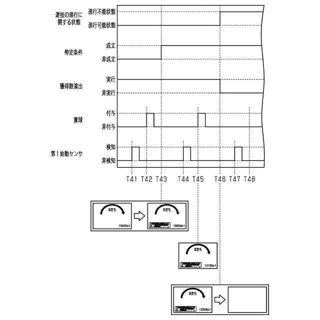 遊技の進行に関する状態の移行に伴うパチンコ遊技機の制御及び動作を説明するためのタイミングチャートである。