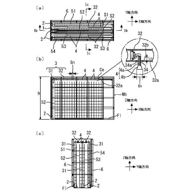 (a)は、実施の形態による高天井倉庫の空調システムの平面図、(b)は、図1(a)のIb-Ib断面図、(c)は、図1(a)のIc-Ic断面図である。