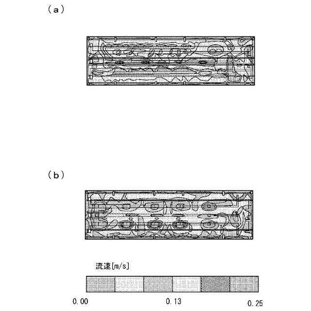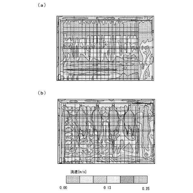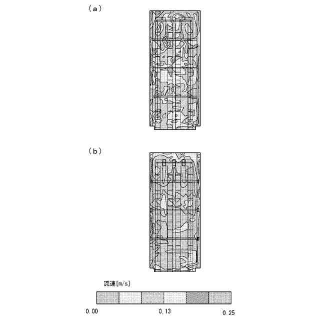 (a)は、本実施の形態におけるYZ面内での流速分布を示すシミュレーション結果、(b)は、従来例のYZ面内での気体流速分布を示すシミュレーション結果である。