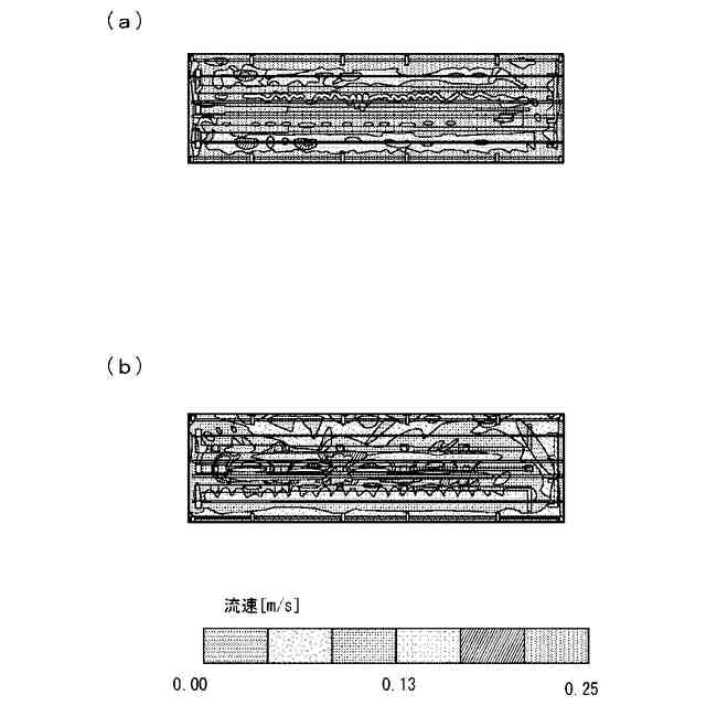 (a)は、本実施の形態におけるXZ面内での流速分布を示すシミュレーション結果、(b)は、従来例のXZ面内での気体流速分布を示すシミュレーション結果である。