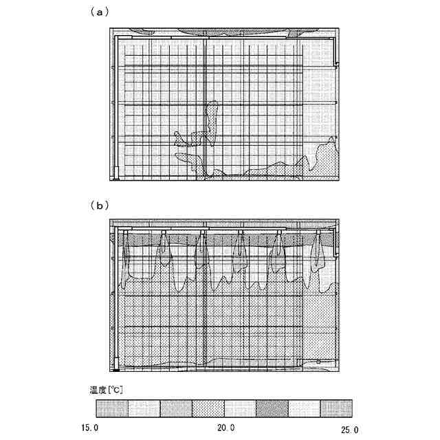 (a)は、本実施の形態における高さ20mのXY面内での温度分布を示すシミュレーション結果、(b)は、従来例の高さ20mのXY面内での温度分布を示すシミュレーション結果である。