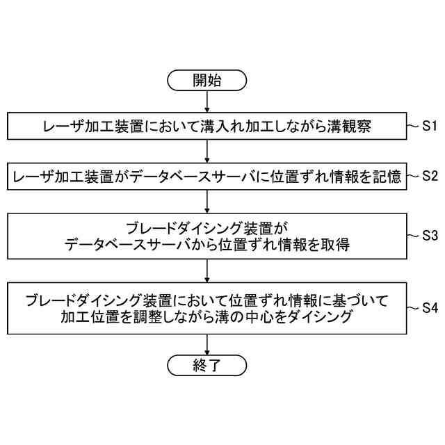 【解決手段】分割予定ラインLに沿ってレーザ光により溝Cが加工されるウェハWに対し、溝の加工と同時に、分割予定ラインLに対する溝Cの位置ずれを示す位置ずれ情報を取得する制御装置38と、取得された位置ずれ情報をウェハWの固有の情報と紐付けて記憶するデータベースサーバ60と、記憶されたウェハWに対応する位置ずれ情報に基づいてウェハWを溝Cに沿ってブレードにより切削加工するブレードダイシング装置50と、を備える。