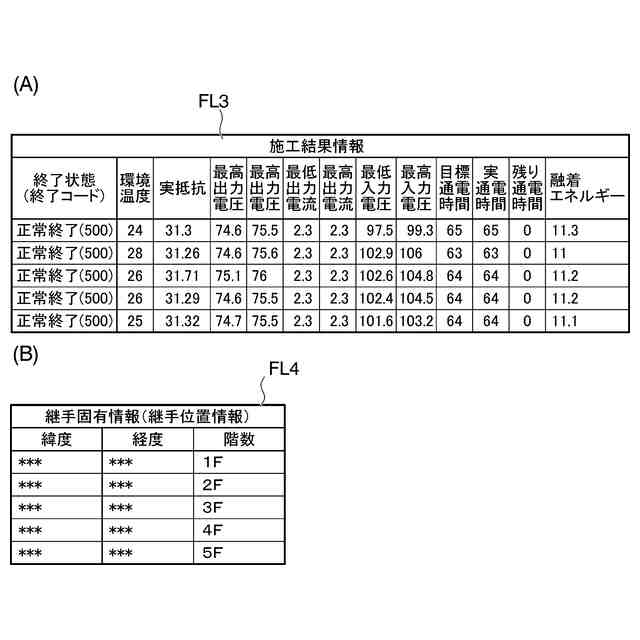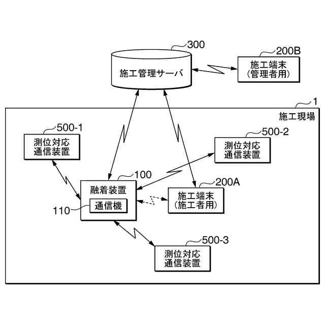 図1は、本実施形態の施工管理システムの一例を示している。同図の施工管理システムは、融着装置100、施工端末200(200A、200B)、施工管理サーバ300、及び測位対応通信装置500(500-1、500-2、500-3)を備える。