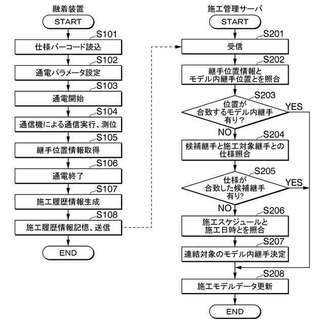 第1実施形態における融着装置と施工管理サーバとが施工モデルデータへの施工履歴情報の連結に関連して実行する処理手順例を示すフローチャートである。