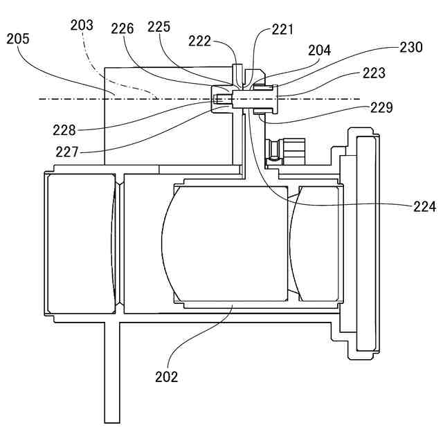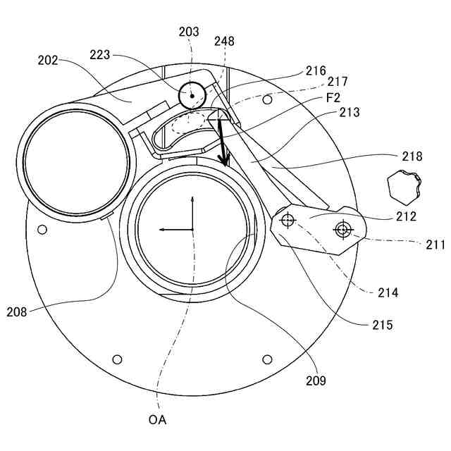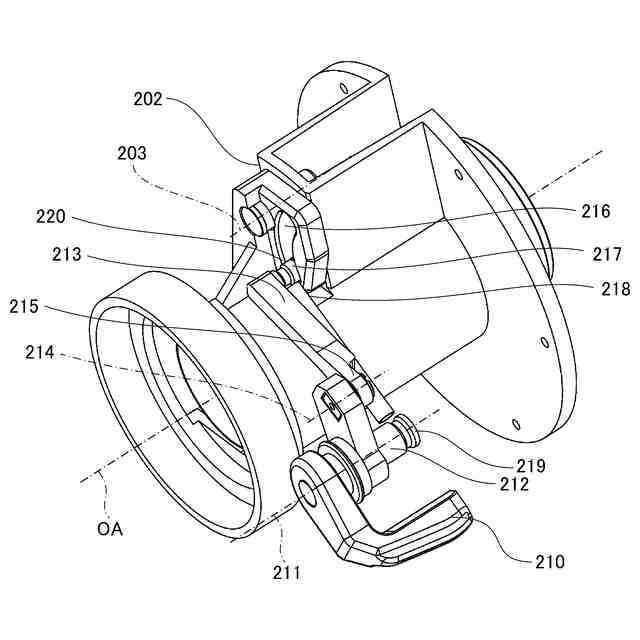 一端が前記操作部の操作に応じて光軸と平行な軸を有する第2の回転軸の軸部に設けられる第1の係合部に係合し、他端が前記第2の連結部に設けられる第2の係合部に係合する付勢部材と、を有する、