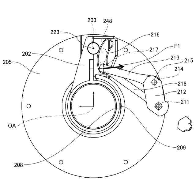 この特許文献1におけるエクステンダーの挿抜機構には、可動部に保持されたエクステンダーの拡大光学系の中心軸が光軸上にある位置と、光軸上から退避した位置との間で可動部を回動する機構がある。また撮影者の操作によって可動部の回動を操作する操作部がある。可動部は回転軸A4周りに回動し、撮影者の操作力が操作力伝達手段としてのギア列によって、可動部に伝達される。その際、撮影者がエクステンダーの拡大光学系の中心軸が光軸上にある位置、あるいは光軸上から退避した位置のどちらかに操作した際には、その位置にエクステンダーの拡大光学系が保持される必要がある。そこで、特許文献1では、可動部を付勢し、一端がレンズの外周よりも外側に位置する可動部の少なくとも一部に固定された弾性部材を有する。エクステンダーの拡大光学系の中心軸が光軸上にある位置と退避した位置との間の、所定位置よりも光軸上にある位置側になると、可動部を光軸上にある位置に向けて付勢する。また、可動部が所定位置よりも光軸上から退避した位置側になると、可動部を光軸上から退避した位置に向けて付勢する機構を有している。