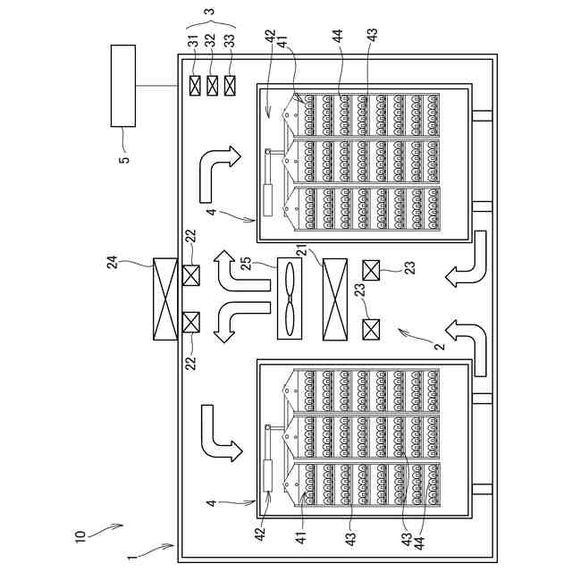 孵卵装置10は、図1に示すように、内部に孵卵室が形成されたケーシング1と、孵卵室内の環境の調整を行う環境調節機器2と、孵卵室内の環境を測定するセンサ3と、孵卵室に設置されるラック4とを備えている。