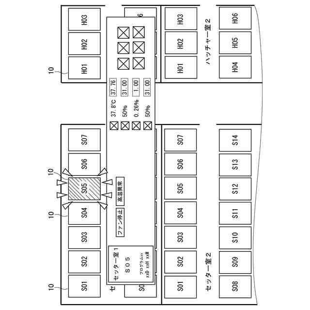 種卵を孵化させる孵卵装置として、特許文献1に示すものが知られている。この孵卵装置は、ファンと、ファンに供給される空気の温度を調整するための冷却手段及び加熱手段と、内部の温度を測定する温度センサを備えている。そして、温度センサの測定値に基づいて、冷却手段や加熱手段を動作させ、例えば室内の温度が37.8℃前後の一定値になるように制御されている。特に、個々の種卵が発する熱量は様々な要因によって変化する。そして、複数の要因から孵化率が決定されるという事情があるため、孵卵装置内の温度などの測定値を観測したり、冷却手段や加熱手段の運転状況を観測したりすることは特に重要である。