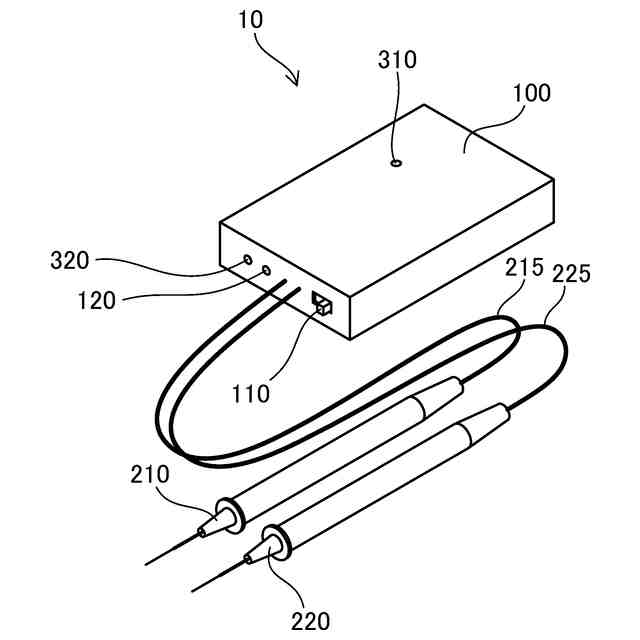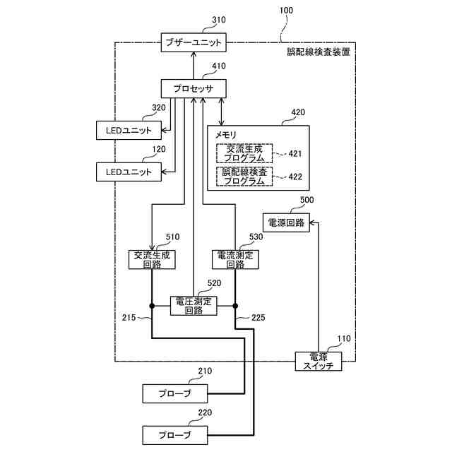 図1は、誤配線検査装置10の外観構成を示す説明図である。誤配線検査装置10は、配電盤、分電盤および制御盤などの電気回路における誤配線の有無を検査する誤配線検査に用いられる装置である。誤配線検査装置10は、筐体100と、電源スイッチ110と、LEDユニット120と、ブザーユニット310と、LEDユニット320と、プローブ210と、ケーブル215と、プローブ220と、ケーブル225とを備える。