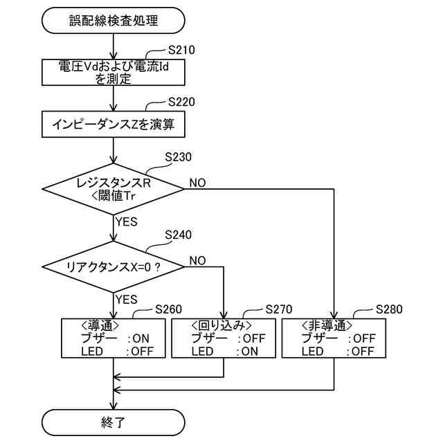 誤配線検査装置は、配電盤、分電盤および制御盤などの電気回路における誤配線の有無を検査する誤配線検査に用いられる装置である。誤配線検査においては、トランス、モータおよび半導体など、直流抵抗が比較的に低い部品が被検査回路に並列接続されている場合における電流の回り込みによる誤診が問題となる。特許文献1には、電流の回り込みによる誤診を防止するために、被検査回路のインピーダンスが所定値以下である場合に発振する発振回路を備え、この発振回路によってブザー音を発生させる誤配線検査装置について記載されている。