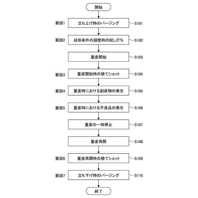 図3は、射出成形機の立ち上げから立ち下げまでの材料ロス量の発生する要因の一例を示すフローチャートである。