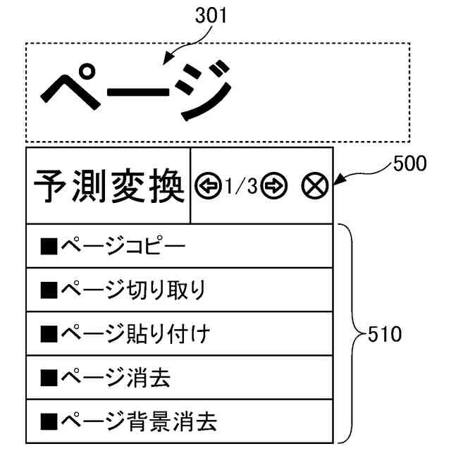 図1は、操作コマンドの表示例を示す図である。操作コマンドとは、表示装置を操作するために用意されている、特定の処理の実行を指示する命令をいう。表示装置は、ユーザーによる手書きデータから変換された文字列に、予め対応付けられている操作コマンドの候補510を表示させる。文字列とは、手書きデータの文字認識により変換されたオブジェクトである。文字列は文字コードで表すことができる。文字列、及び、文字コードに変換しないことが確定している手書きデータは選択ジェスチャーによる選択対象となる。文字列は、1つ以上の文字であり、文字には、ひらがな、かたかな、漢字、アルファベット、数字、及び記号が含まれる。ユーザーが実行したい操作コマンドを選択すると該操作コマンドが実行される。図1では行頭の「■」が操作コマンドを意味している。