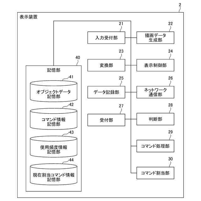 【解決手段】表示装置であって、ユーザーからの操作を受け付けることによって、操作コマンドを実行する表示部品を表示させる表示制御部と、表示部品に割り当てられている第2の操作コマンドと、該第2の操作コマンドを実行するために入力された手書き入力から変換された第2の文字列に関する情報とを対応付けて記憶する記憶部と、第1の文字列に対応付けられている操作コマンドの候補から、第1の操作コマンドの選択を受け付ける受付部と、受付部が第1の操作コマンドの選択を受け付けた場合、第1の文字列に関する情報と、第2の文字列に関する情報とに基づいて、所定の条件を満たすと判断した場合に、第1の操作コマンドを表示部品に割り当てるコマンド割当部と、を有し、表示制御部は、該表示部品を表示させる。