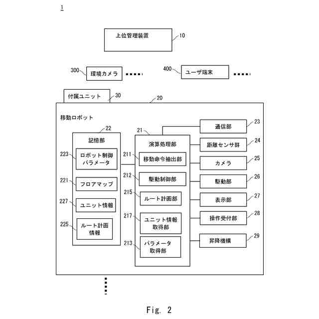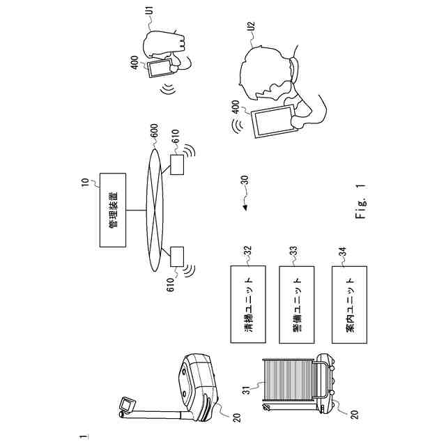 本実施の形態にかかる管理システムは複数のサービス(タスクともいう)を実行可能な自律移動ロボットを管理するためのシステムである。図1は、管理システム1の構成を示す模式図である。管理システム1は、移動ロボット20と、上位管理装置10と、付属ユニット30と、ネットワーク600と、通信ユニット610と、ユーザ端末400と、を備えている管理システム1は、1又は複数の移動ロボット20と、その付属ユニット30を管理するためのシステムである。