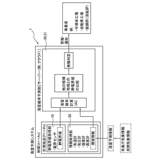 (1)上述した課題を解決すべく提供される本発明の落雷予測システムは、複数の地域に配置された複数の計測地点における大気の静電界値を取得する静電界値取得部と、前記計測地点を中心とした所定の範囲における環境情報を取得する情報取得部と、落雷確率を予測する落雷確率予測部と、を有し、前記地域は、一の前記計測地点を含む所定の範囲として設定されており、前記落雷確率予測部は、前記静電界値と前記環境情報とに基づいて、前記地域毎の前記落雷確率を予測すると共に、予測された前記落雷確率が所定の閾値以上の前記地域に対して通知を行うこと、を特徴とするものである。