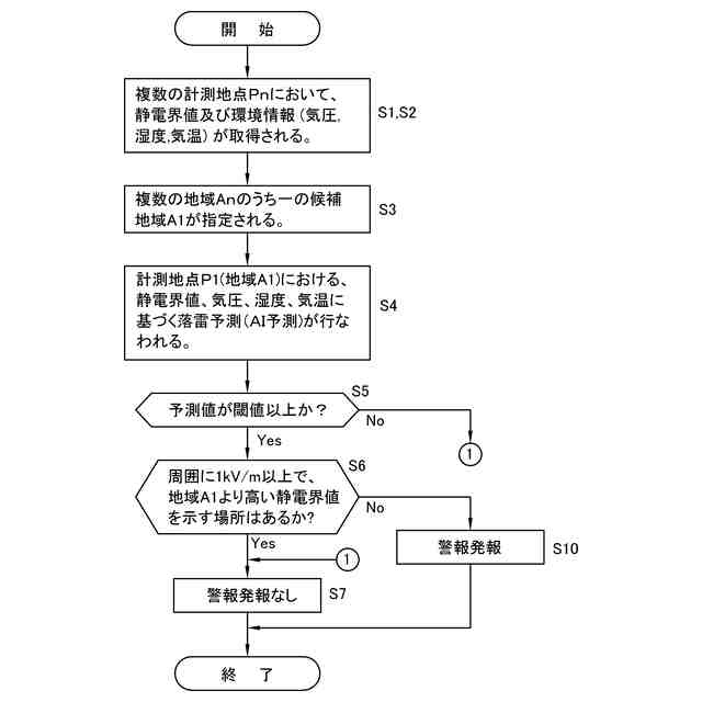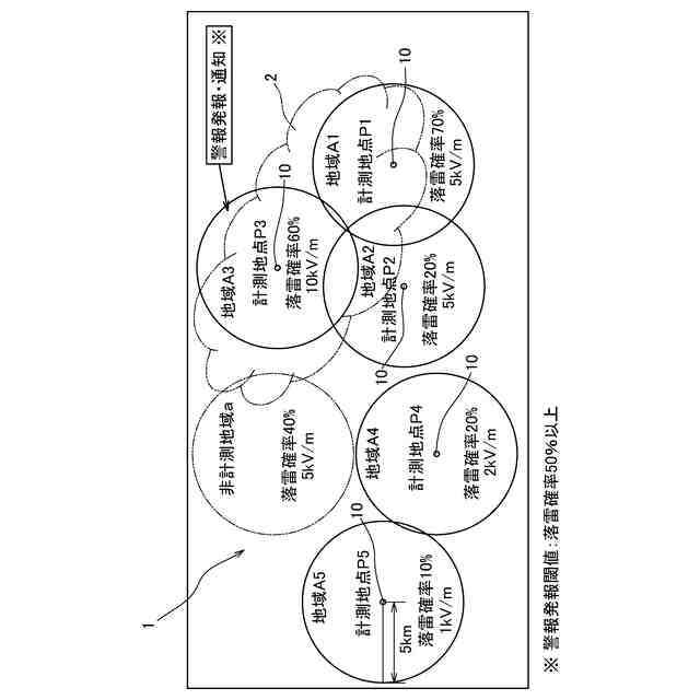 ところで、特許文献1に係る従来技術は、単独の場所における静電界値の測定結果及び雷活動度に基づいて、当該場所における落雷予測を行うものとされている。しかしながら、特許文献1に係る従来技術では、落雷予測の範囲が限定され、落雷予測の精度が低下する問題がある。また、特許文献1に係る従来技術は、落雷が発生した履歴と、気象情報とから雷の動きを予測して警報等を発報するものとされている。しかしながら、特許文献1に係る従来技術は、単独の場所での静電界値及び雷活動度に基づいて落雷予測の判断が行われるため、予測の空振りや見逃しが発生しやすい問題がある。