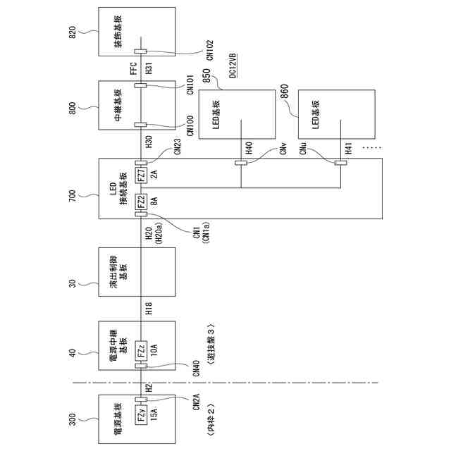 演出制御基板とLED接続基板の間を1対のコネクタによる1つの伝送路で伝送する単系伝送例の説明図である。