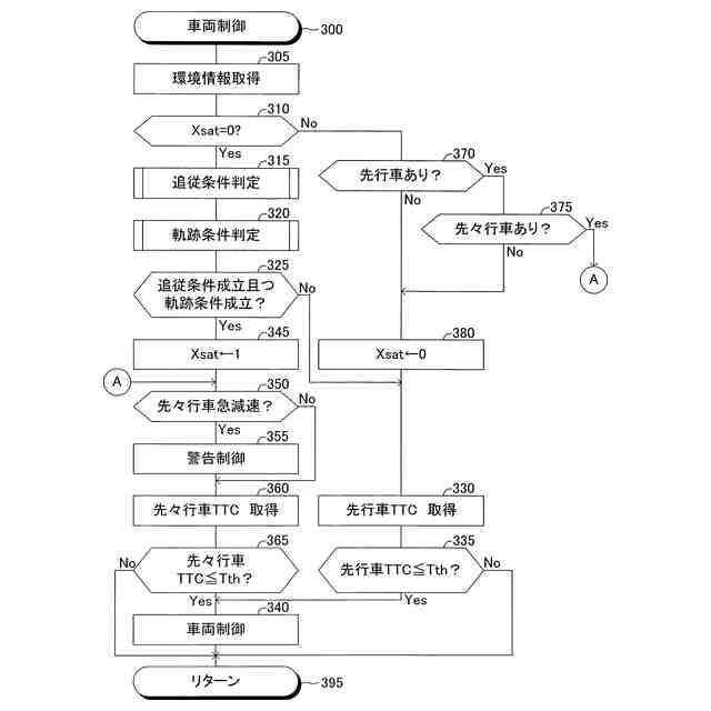 前記自車両の前方に存在する先行車が前記先行車の前方に存在する先々行車を追従しているとの追従条件、及び、前記先々行車が走行した軌跡を表す先々行車軌跡を前記自車両及び前記先行車が走行しているとの軌跡条件、の両方が成立した場合(ステップ325「Yes」)、前記先々行車の衝突リスクを表す第1指標値(先々行車TTC)を用いて前記衝突条件が成立したか否かを判定し(ステップ365)、