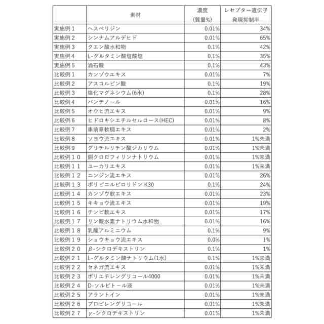 態様1の肺炎原因菌付着レセプター発現抑制剤は、ヘスペリジン、シンナムアルデヒド、クエン酸水和物、L-グルタミン酸塩酸塩及び酒石酸からなる群より選択される少なくとも一種を含有する。