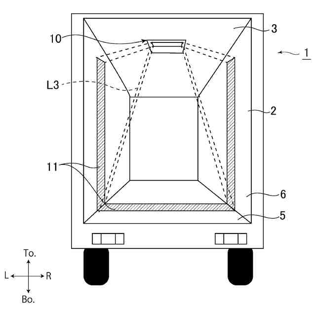 図1は、本実施形態における照明装置10が天井3に搭載されたトラック1の荷台2の後方視を示す説明図である。