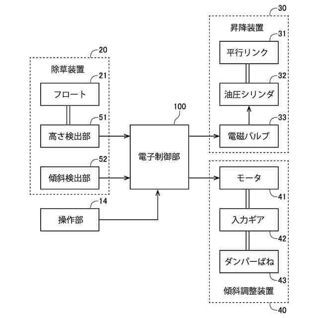 【解決手段】本発明の除草機は、走行車体と、走行車体に取り付けられる除草装置20と、昇降装置30と、傾斜調整装置40と、電子制御部100とを有する。除草装置20は、左右方向に並ぶ複数の除草部と、除草装置20の傾きを検出する傾斜検出部52とを有する。除草装置20は、上方の退避位置と下方の除草位置とに移動可能である。電子制御部100は、傾斜検出部52の検出結果に基づいて傾斜調整装置40を動作させる水平制御を実行可能である。電子制御部100は、除草位置において自動的に水平制御を実行するとともに、退避位置においても水平制御を実行可能である。これにより、非除草時(除草装置退避時)に水平制御を可能となり、除草機の傾きによって除草装置の左右の端部が地面や田面に接触することを抑制できる。
