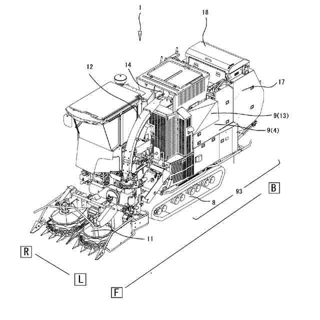 図示した、R(右)、L(左)は、刈取細断収穫機1(農作業機)の進行方向を前(F)として、そのR(右)とL(左)をいう。図中、後は(B)と図示される。